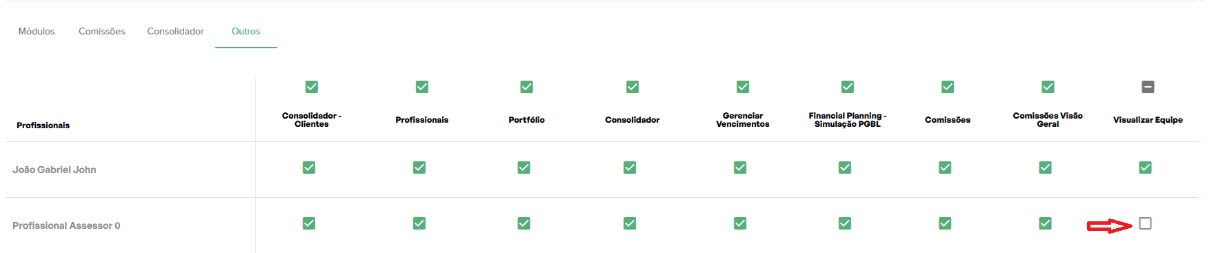 - Localize a profissional desejada e, na coluna “Visualizar equipe”, desative essa opção.