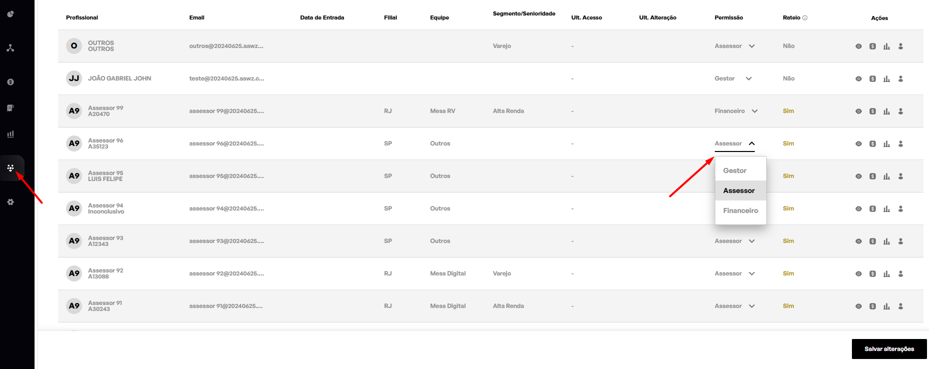 - Identifique o profissional desejado e na coluna “Permissão” escolha o perfil desejado.