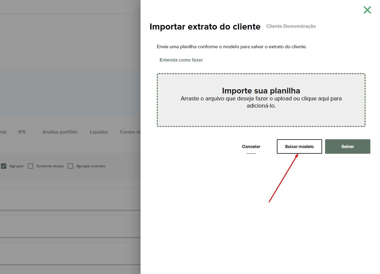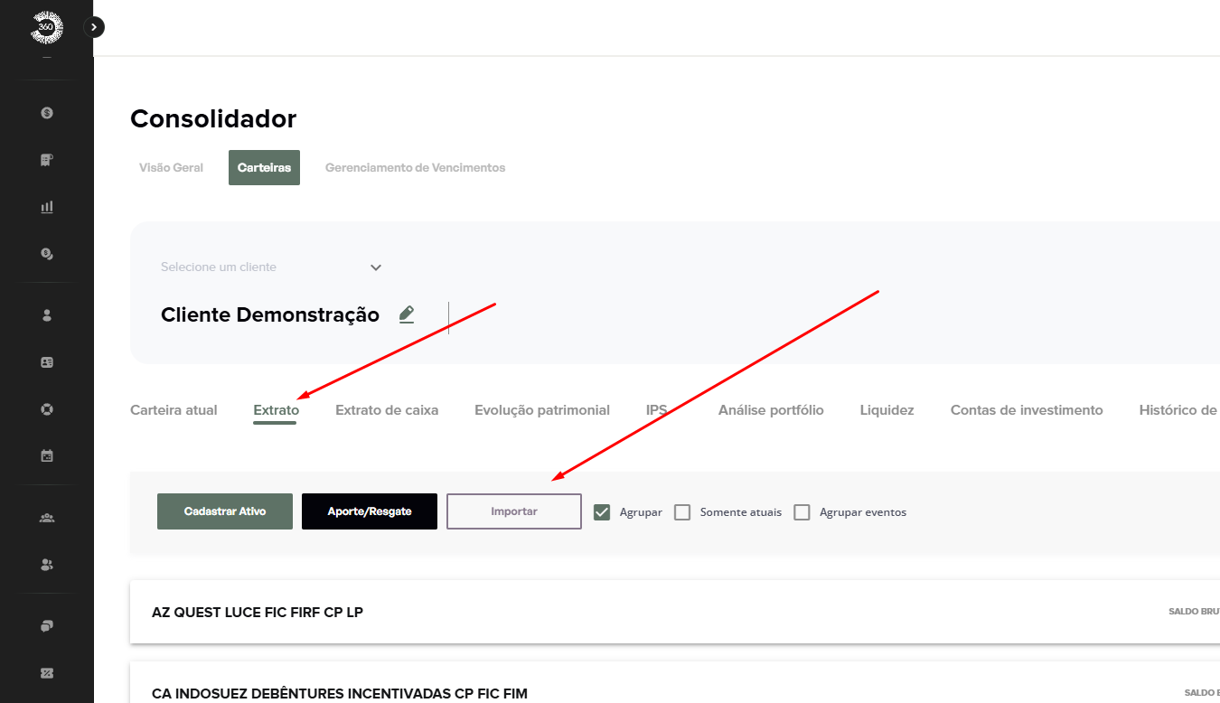 Para importar ativos em massa para a carteira de um cliente, visite a seção EXTRATO na visão geral de um cliente, e clique no botão IMPORTAR.