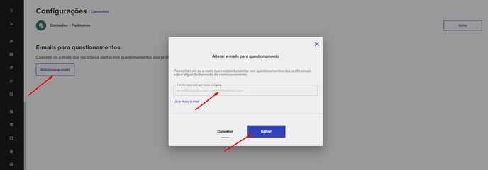 Para configurar um ou mais e-mails que receberão os alertas referentes aos questionamentos feitos pelos profissionais sobre algum fechamento de comissionamento, siga o passo a passo: