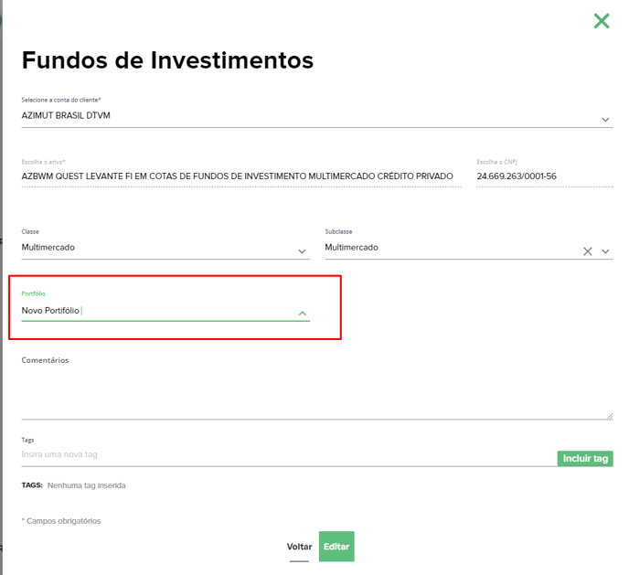 Um exemplo comum, é adicionar todos os ativos de renda fixa, de uma instituição específica, em um prazo de vencimento específico em um único portfólio, permitindo detalhar entre eles quando realizar um filtro na visualização geral da carteira.