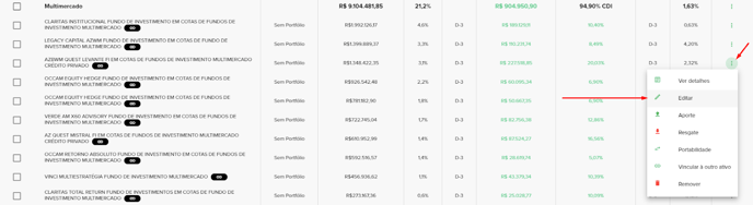 Para cadastrar um portfólio na plataforma, selecione o ativo que deseja adicionar o novo portfólio e clique em Editar nos 3 pontos dentro da visualização geral da carteira.