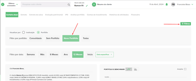 Realize filtros por instituição, portifólio e períodos na carteira do cliente selecionado.