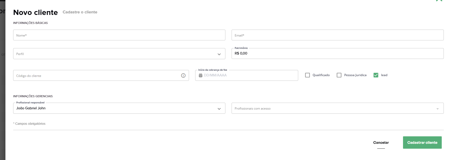 Para cadastrar um novo cliente na plataforma de consolidação de carteiras, siga os passos abaixo: