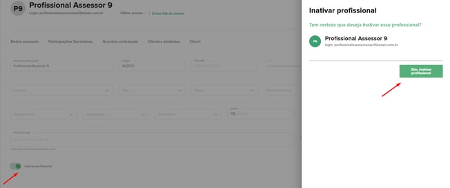 - Em seguida, ative a opção “Inativar profissional” e confirme o procedimento.