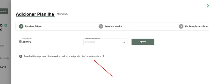 Na primeira etapa, selecione o mês de competência em seguida, selecione a corretora “Outros” e clique em "Baixar o template".