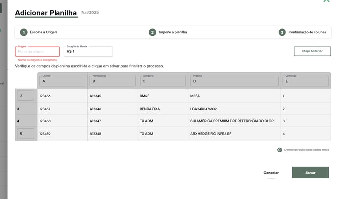 No campo Origem, defina um nome para identificar o fornecedor (ex: Câmbio, Crédito, Seguros).