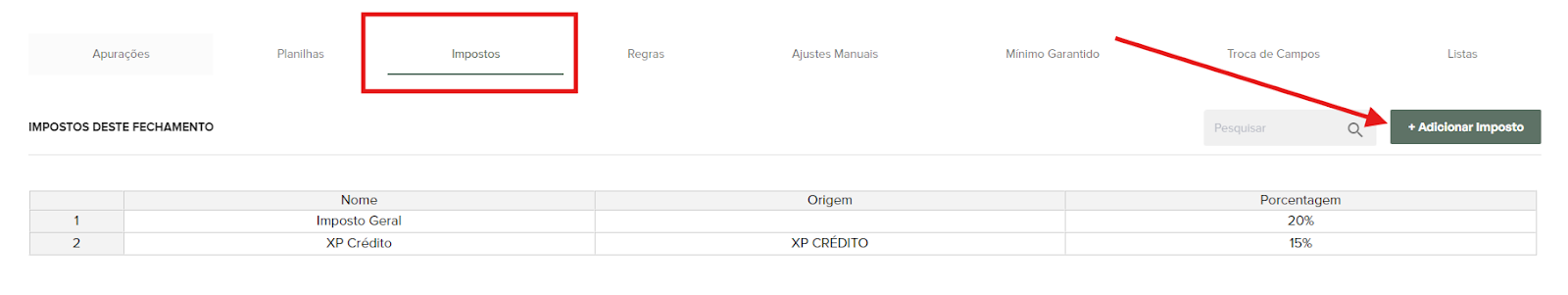 Para o cadastro de um novo imposto, basta apenas clicar no botão ADICIONAR IMPOSTO e realizar o cadastro.