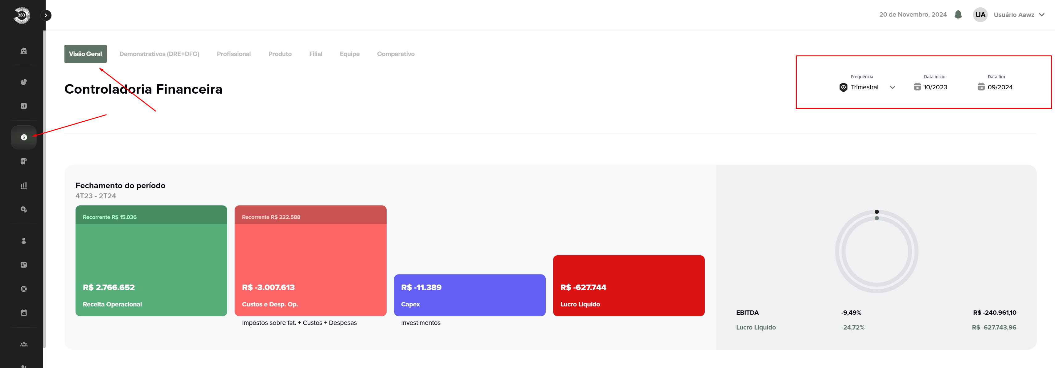 Dentro do módulo financeiro, na primeira página temos uma visão geral da saúde financeira da empresa. Nela é possível realizar filtros de data para realizar a análise desses dados. Temos como filtrar a data de início de fim do período que queremos analisar, e a frequência que os dados serão agrupados, no exemplo abaixo temos um filtro de 1 ano e a frequência dos dados trimestrais, ou seja, teremos a visualização de 4 trimestres com esses filtros.