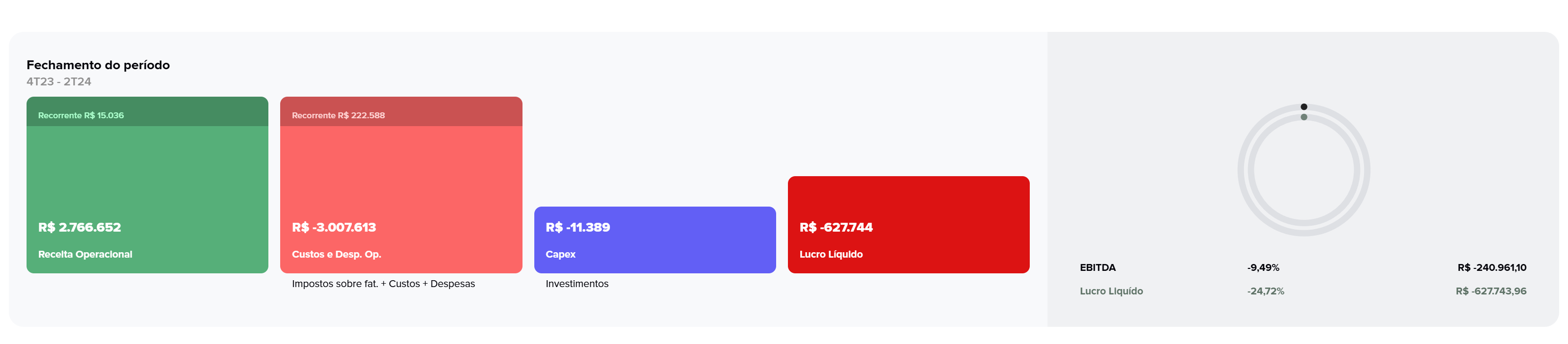 Na primeira visualização dessa página, temos o fechamento financeiro do período analisado de uma forma menos detalhada, para uma visualização mais rápida da operação.
