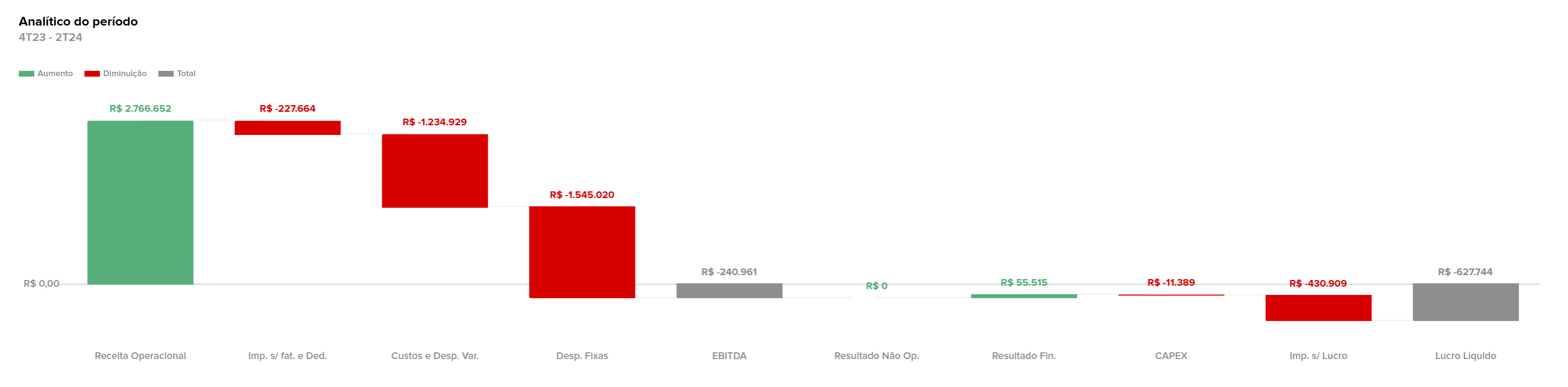 Logo após, teremos um gráfico que dispõe das informações financeiras um pouco mais detalhadas para as análises, com a visualização de cachoeira das principais linhas de receitas e despesas.
