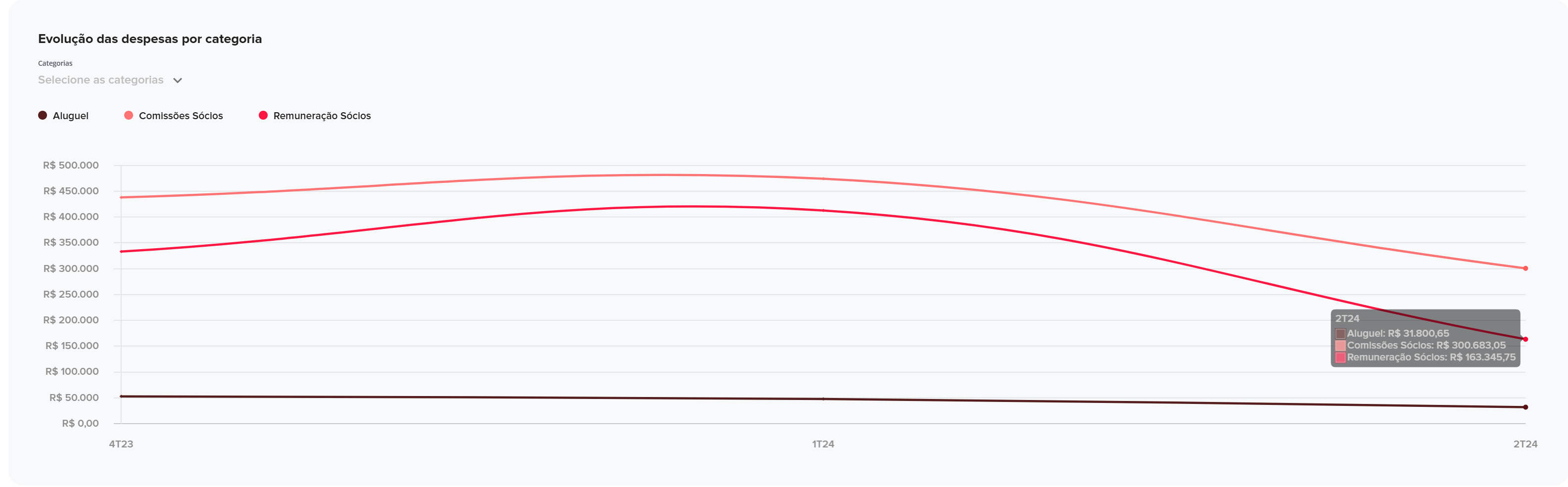 Continuando dentro da página, vamos ver um gráfico para acompanhamento das despesas ao longo do período. Dentro dessa visualização é possível selecionar as categorias para acompanhamento das despesas.