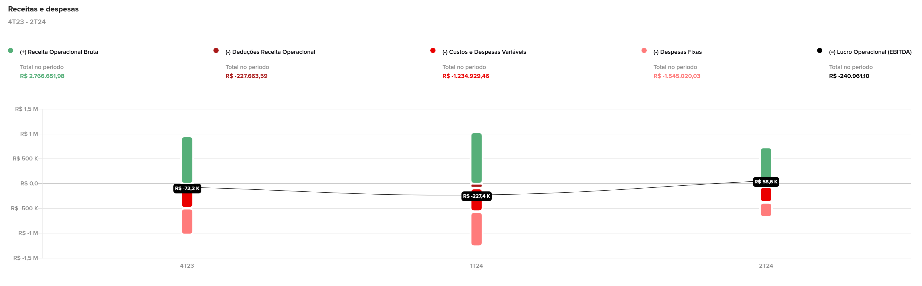 No próximo gráfico temos uma quebra das informações do período pela frequência escolhida no filtro inicial. Aqui é possível ver o total do período e como foi o trimestre da operação.