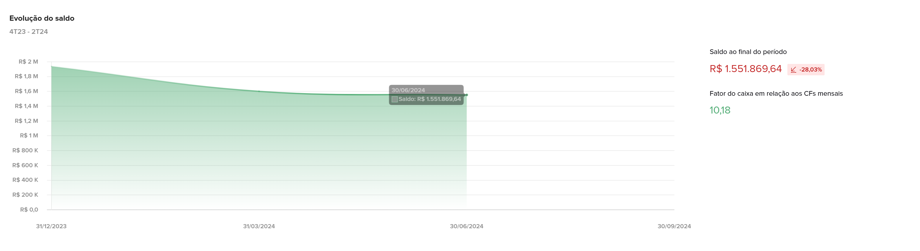 O penúltimo gráfico da página é possível ver a evolução do saldo da empresa no período e o fator de caixa em relação aos custos fixos mensais, ou seja, traz quantos meses a operação aguenta caso não tenha lucro positivo.