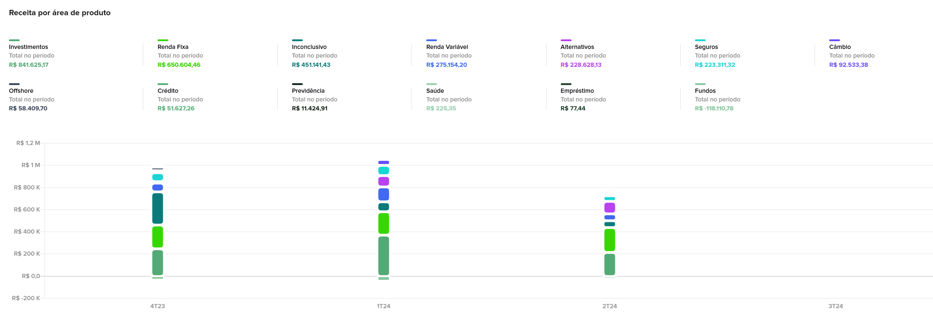 Por último, temos um detalhamento das receitas da operação no período analisado. Nessa visualização temos o total de receita por produto gerado e segregado trimestralmente para análises do gestor.
