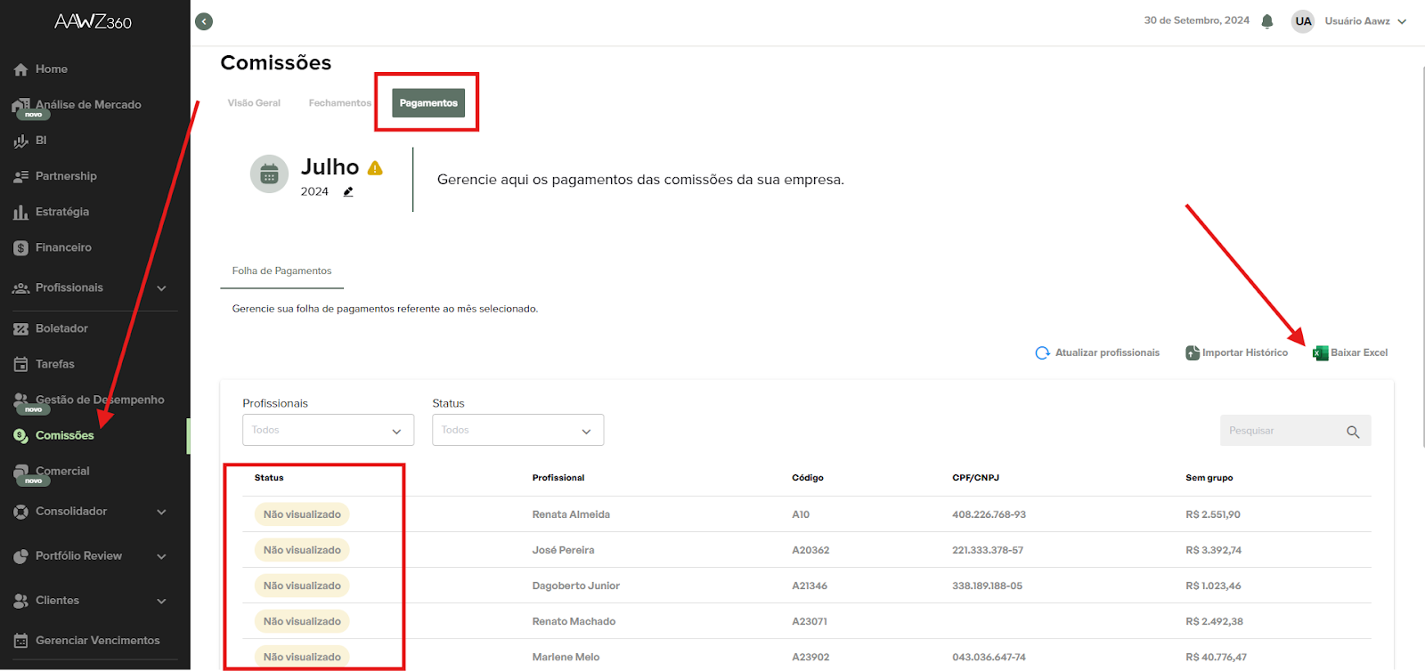 Todo o profissional que visualizar sua comissão, aparecerá como visualizado ao lado do seu nome, e depois da visualização ele poderá “Aprovar” ou “Questionar” o valor, todos essas Status ficaram visíveis para o gestor na aba de PAGAMENTOS.