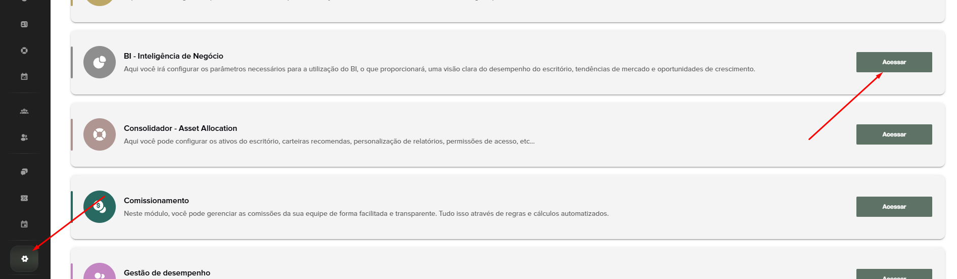 Na página de configurações navegue até o CONFIGURAÇÕES BI.