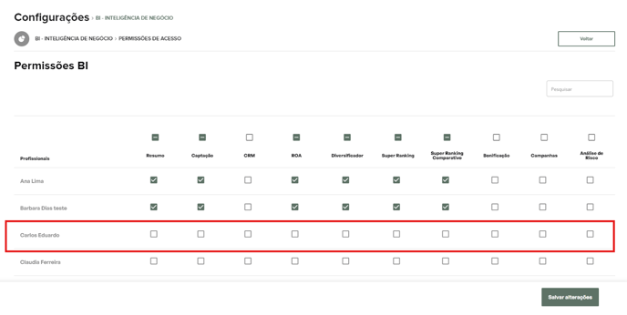 No caso acima, o profissional Carlos Eduardo no momento não tem nenhuma visualização ao BI, caso o Gestor queira modificar essa visualização, basta ligar as caixinhas correspondentes as telas que serão liberados para o usuário, e clicar no botão “Salvar Alterações”.