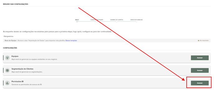 Role a janela para baixo até encontrar a seção de configurações e selecione a opção PERMISSÕES BI.