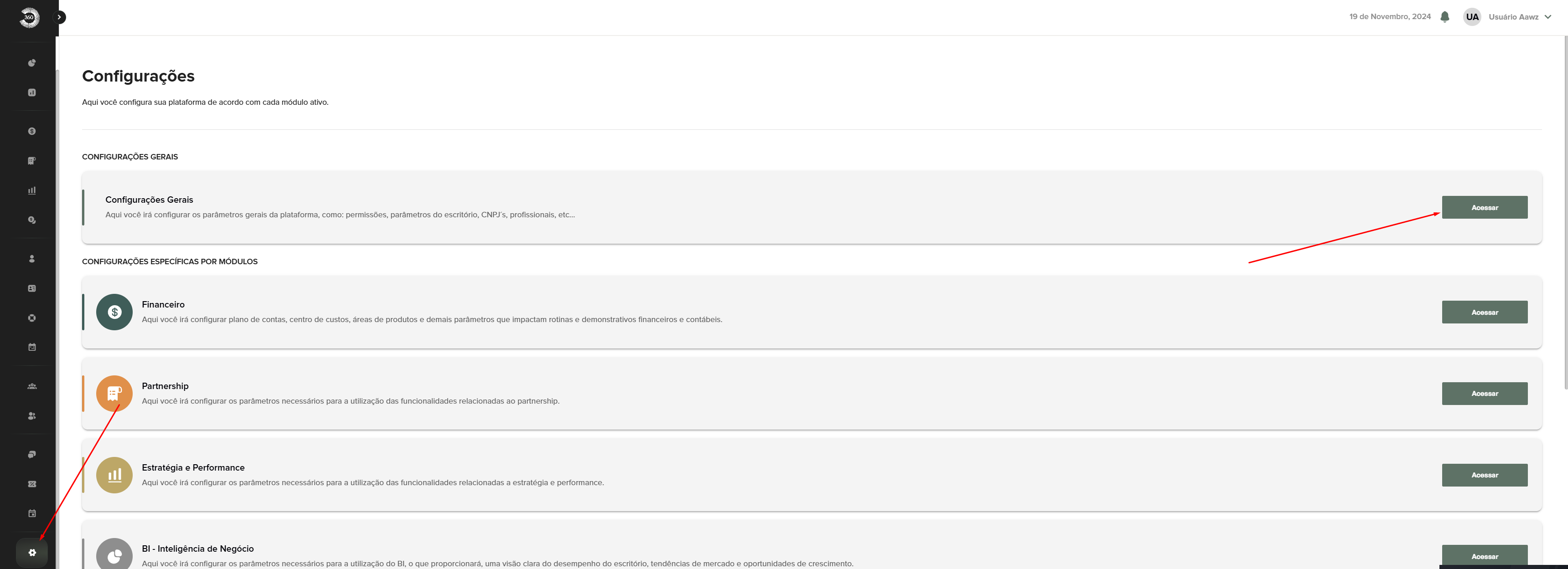 Para acessar as configurações de permissão, no menu suspenso à esquerda, entramos no módulo de CONFIGURAÇÕES e acessamos a parte de CONFIGURAÇÕES GERAIS, como mostrado abaixo: