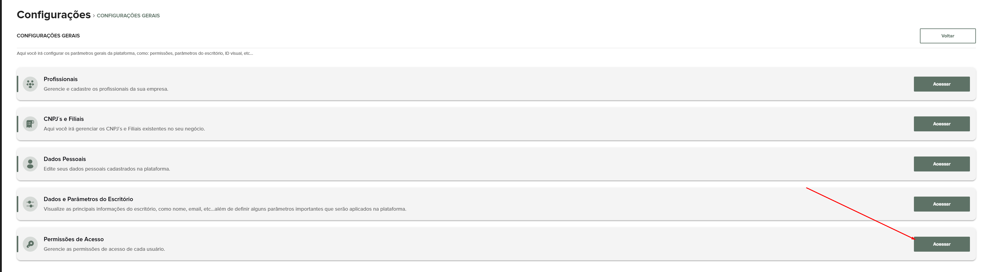 Dentro da tela de “Configurações Gerais”, iremos acessar a página de PERMISSÕES DE ACESSO