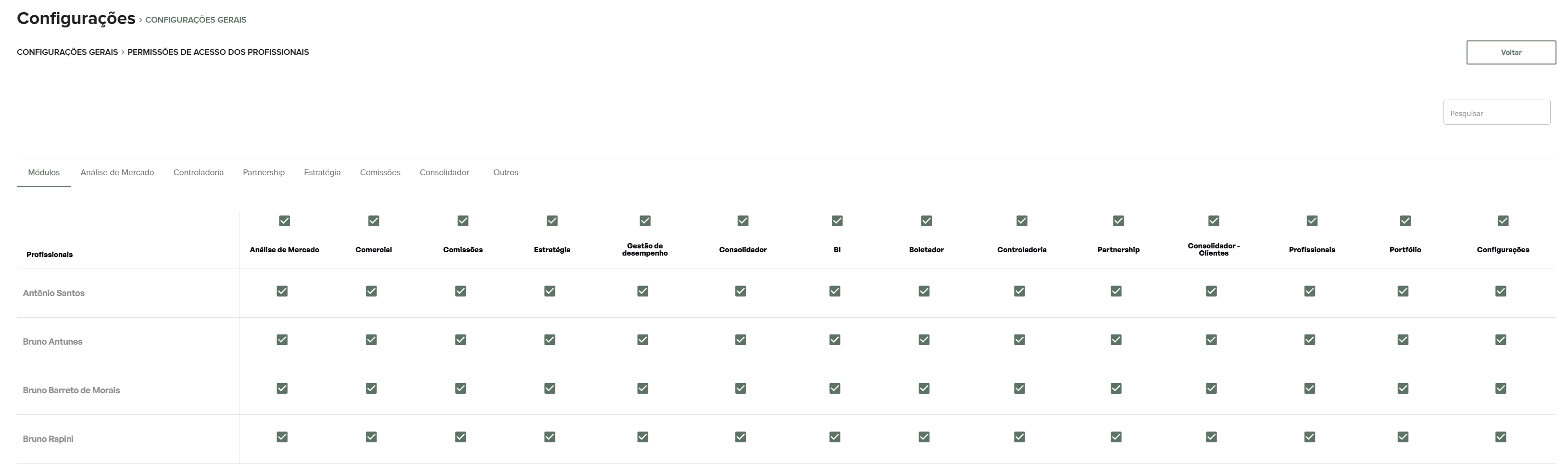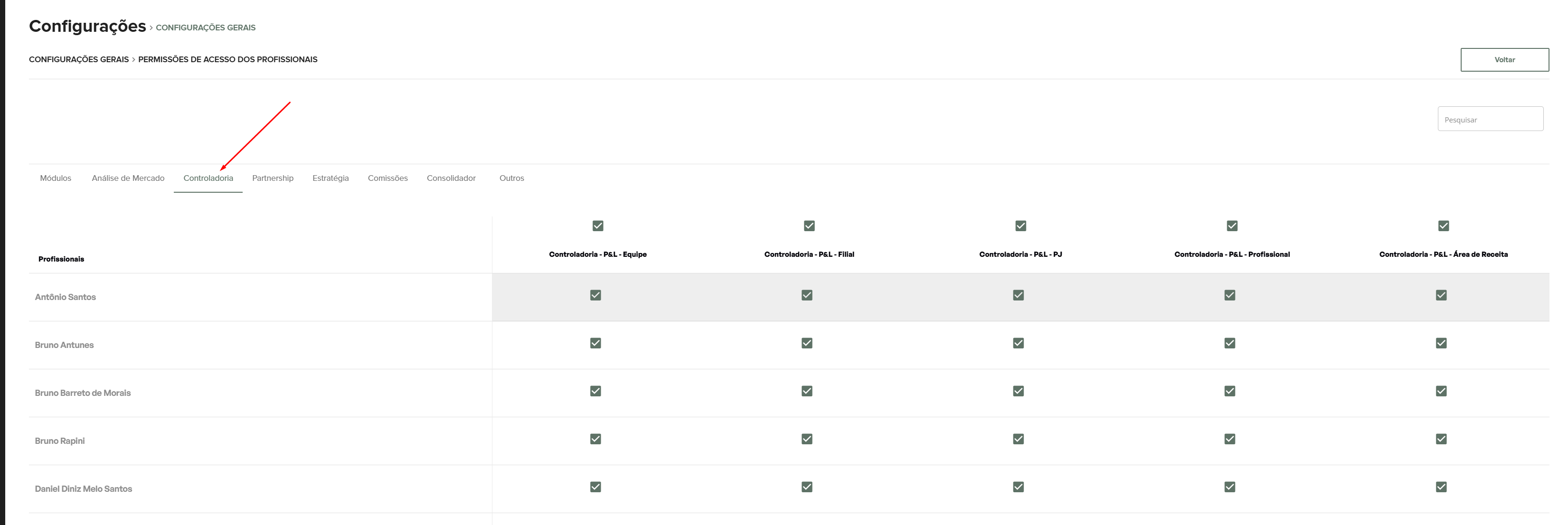 Podemos alterar essas configurações a nível módulo dentro da tela de configurações, por exemplo: Desligar a visualização da controladoria financeira para profissional X.