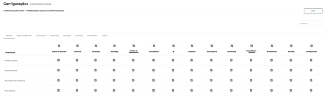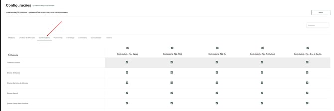 As permissões podem ser ajustadas por módulo, dentro da tela de configurações. Por exemplo, é possível desativar a visualização da Controladoria Financeira para o profissional X, conforme necessário.